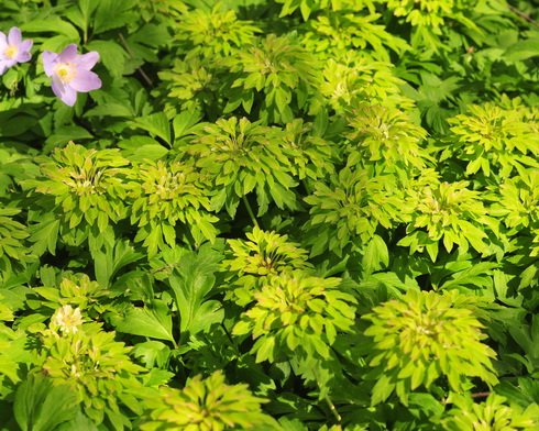 A much admired woodland perennial for partial shade or shady moist soils. Foliage on this species is dissected into finger-like growths, only one leaf per petiole. The stem resides below the soil surface and is dark brown in colour. Multiplication is by division of these rhizomes. Flowers are normally daisy-like and just over 2 cms wide. This variety is very much different from the rest of the species - the petals are reduced to leaves, making a rosette of deep green foliage instead of a flower. These can often last for over one month if the weather conditions are cool. Overall flowering period is around eight weeks long.