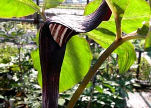 A relatively new species for us to offer here. Approaching the beauty of Arisaema sikokkianum but not quite as tall or white in the flower. Growth begins in mid May on this species. As with others, the spike emerges clothed in a sheath leaf, the leaves emerging immediately after the flower or at the same time. Leaves are digitate and deep matte green with light purplish occasionally with speckles over the upper surface. Flowers are deep brown or occasionally green a whit and the hood folds over the top of the flower. They tend to last a little longer than most Arisaemas. From 'Zazen' which is a form of Monk meditation - the flower is said to resemble a monk in meditation!