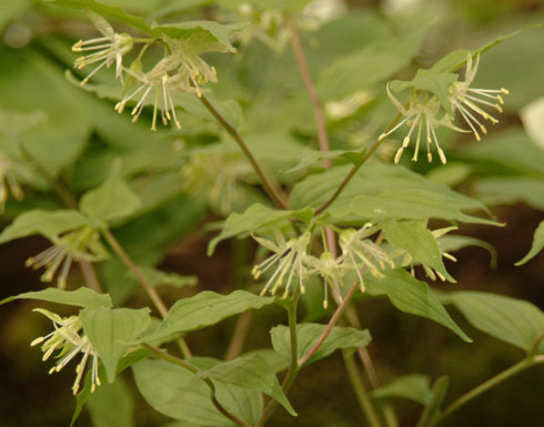 A herbaceous rhizomatous perennial with rigid wiry stems carrying lance shaped pale green leaves from mid spring onwards. Each leaflet has a downy coating to the lower surface. Flowers are held in clusters of up to 3, pale yellowish white or creamy-green, and are pendulous, hanging from wiry stems from the leaf axils. Occasionally, black or red fruits follow.