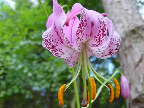 A particularly graceful turkscap type lily from China which produces slender stems carrying glossy lanceolate leaves. This species is stoloniferous and will run around in a given area although we find that it is not invasive. The turkscap flowers are held in numbers up to 15 or so and are pale to deep pink with stronger spotting with a strong sweet scent.