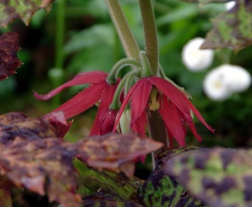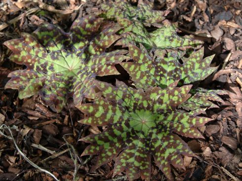 This has to be one of the best introductions in recent years. Growth begins in early spring with the emergence of the leaves. These push up through the soil like a closed umbrella and expand once it is clear of the soil surface. Many leaves are produced per plant, each one being slightly different. The base colour is green but numerous brown-red markings are present which persist right through until autumn. Young leaves have a silky feel adding to the interest. Flowers are bright crimson red and are star-shaped hanging beneath the leaves.