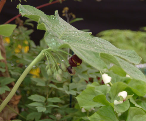 A fantastic plant from China with attractive leaves and flowers. Interest begins in spring when the leaves push through the soil, folded up like an umbrella they slowly expand and enlarge to their full size. Maturity will not be acheived until several years in the ground or container when the leaves approach to feet wide. The petiole joins the leaf in the centre of the lower surface and the blade is almost symmetrical. Up to 3 leaves are produced per stem and the joint of these is where the flowers are held. These are deepest mahogany-red and the petals appear crumpled at first before they enlarge. Each hangs pendulosly.