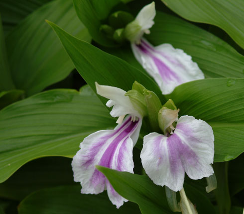 An exotic looking herbaceous perennial with strap-shaped leaves from stout stems rising late in the year. The leaves are a pale green with prominent veining reaching around 25 cms long and clasp the stem. The flowers are the main interest being very much orchid-like in appearance. A single large upper petal and two smaller lower petals of a clean white with purple streaks in colour, this is the largest of the genus. These are borne in loose flower heads although only one or two flowers are present at any one time.