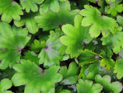 The foliage of these plants is much more like a standard herbaceous perennial - generally palmate with deep indentations, quite fleshy with fleshy petioles also. The foliage on this variety is rich apple-green with scattered fine hairs. The flowers are held in clusters on short stems above the foliage, colour is a rich scarlet red which last for several weeks in late summer/ Early autumn.