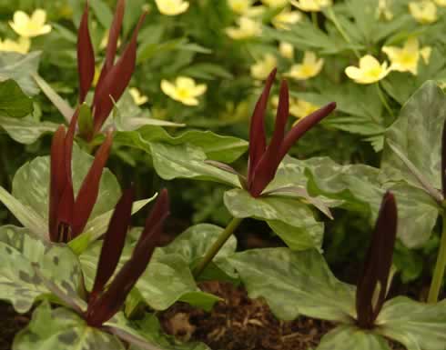 Young plants. This species is a one which is often grouped into T. chloropetalum giganteum to which it is similar, the main difference being the width of the petal. Being one of the first to rise in spring, the foliage is apple green initially with strong deep brown/red mottling which lasts for many weeks until the foliage has fully expanded. The flowers are the main attraction here as always on trilliums. These are deep red and borne from the centre of each leaf, each petal can be up to 10 cms high on well grown plants and quite narrow at around 1 cm or so.