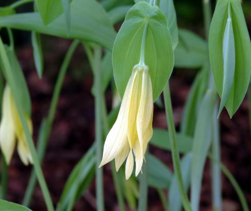Attractive woodland perennial from North America. Herbaceous in nature, this plant grows from stout rhizomes and quickly makes dense clumps of soft green foliage. This is rather bamboo-like in shape - pointed and narrow, and held on rigid stems to around 30 cms high. The flowers are pale yellow yellow and hang pendulously from the upper parts of the stem, maybe a little smaller than U. grandiflora.
